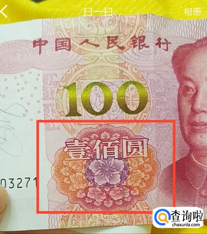 进入扫一扫界面后,将手机对准人民币正面大写的壹佰圆花样处进行扫描,如下图所示。