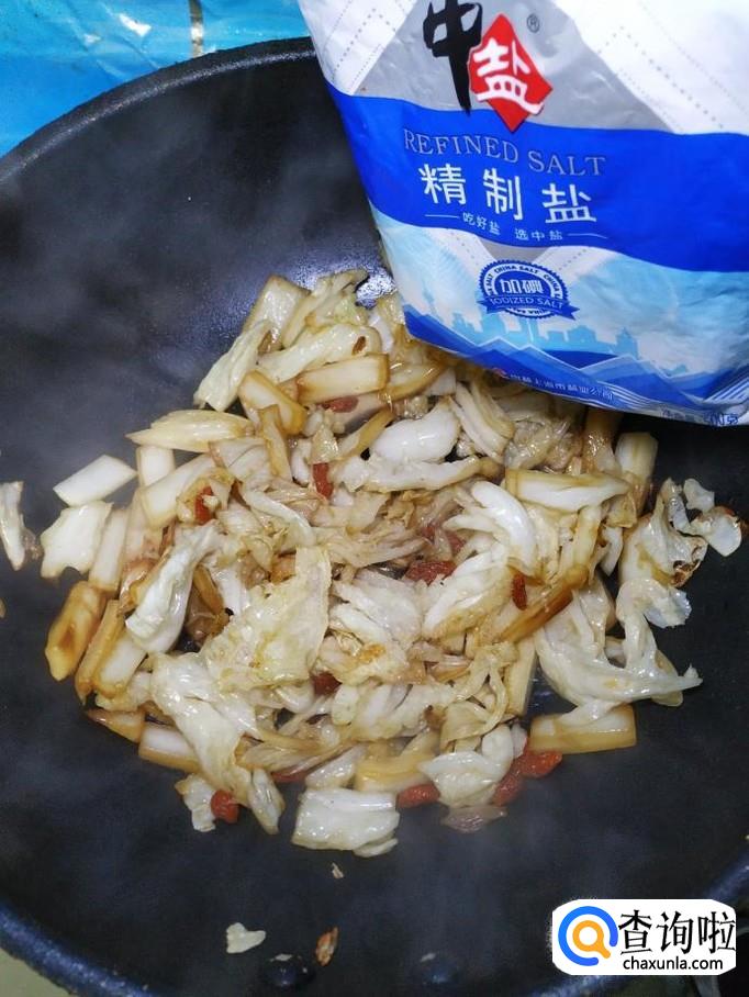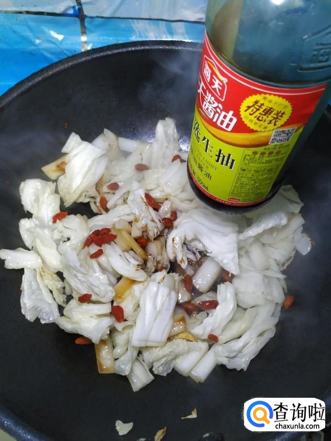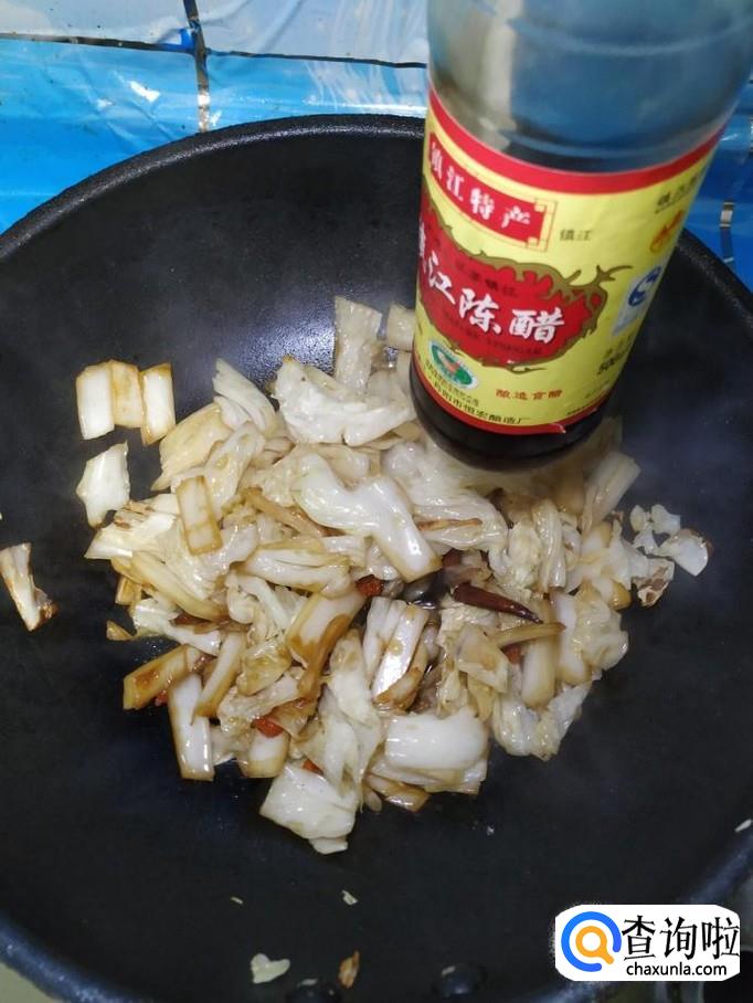 炒至白菜叶变软之后,根据自己的口味,加入适量生抽和陈醋,搅拌均匀。