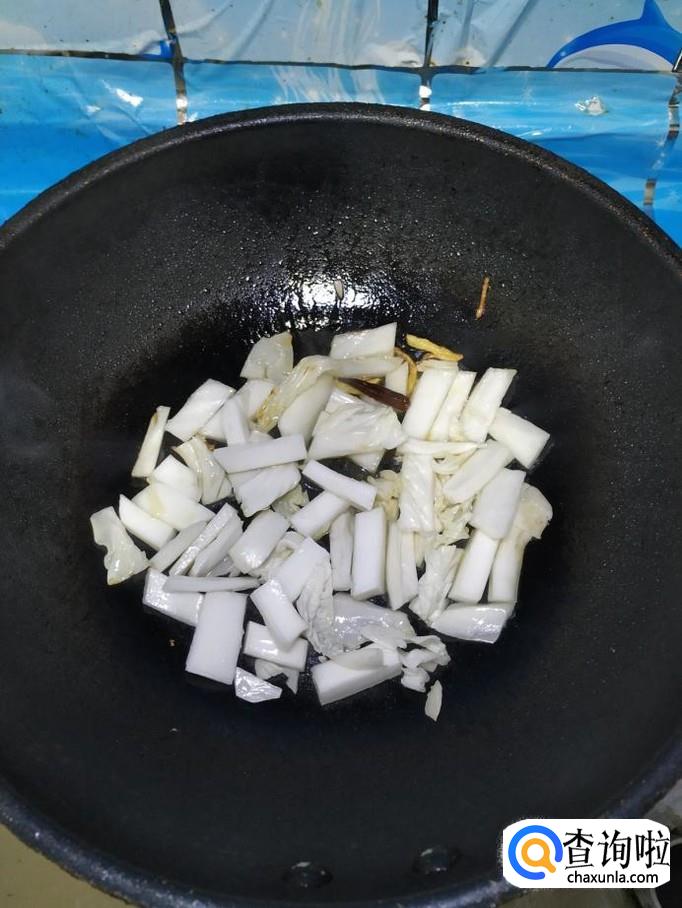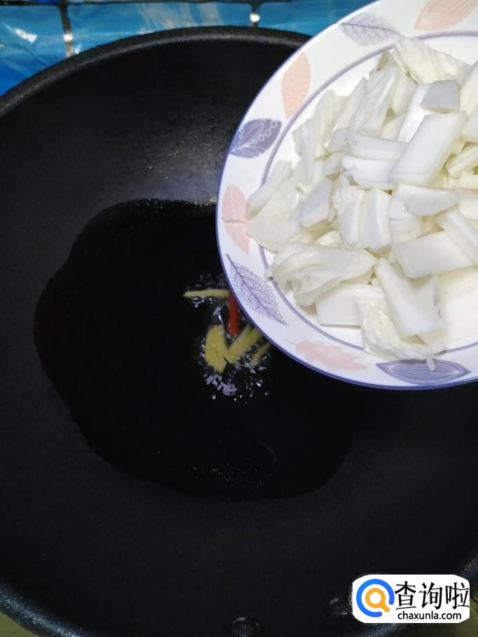 准备适量姜,切成姜丝备用,炒锅中放入适量油,油热后,将姜丝和干辣椒放入锅中炒香,然后将白菜帮子倒入锅中,翻炒均匀。