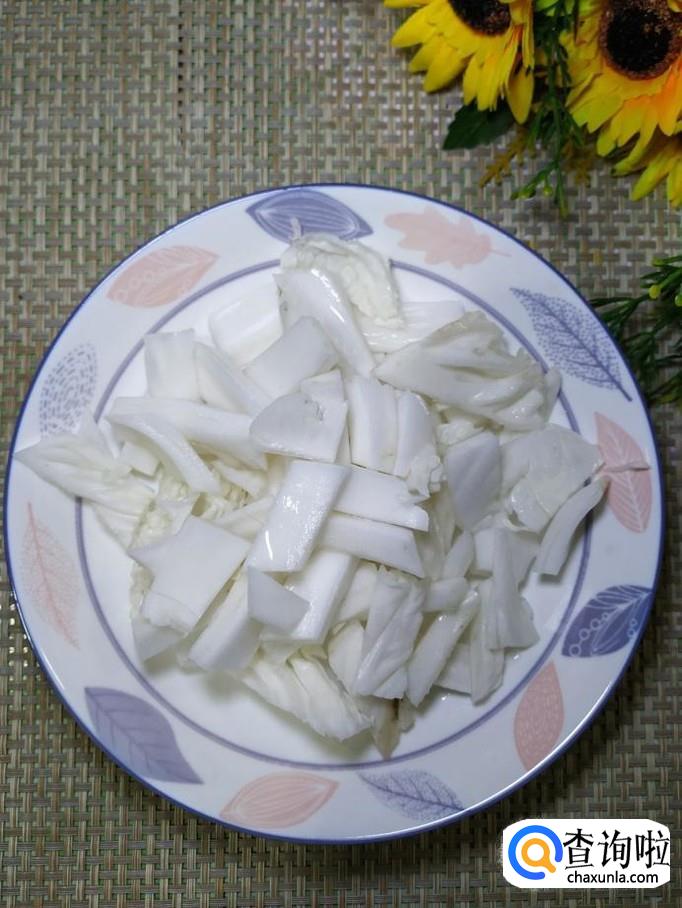 准备适量大白菜,洗净后,将白菜帮子切成条,放入盘中,将白菜叶放入另外一个盘中,沥干水备用。再准备适量枸杞子,用清水泡开。