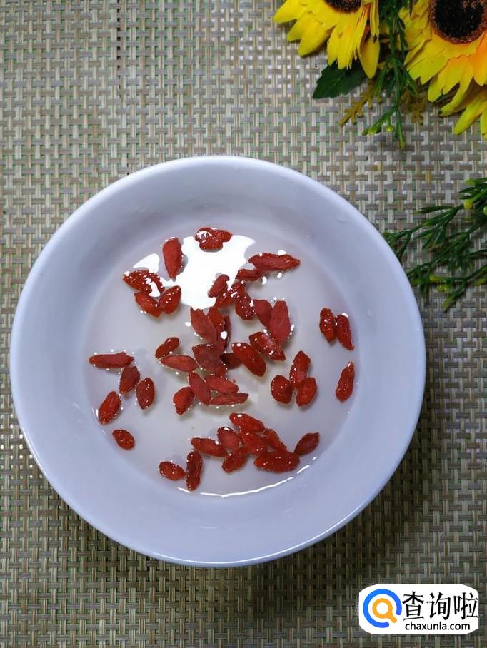 将泡好的枸杞子倒入锅中,翻炒均匀。