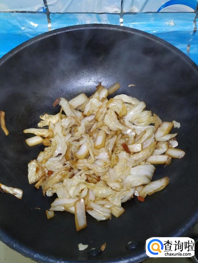 翻炒一两分钟,然后再将白菜叶倒入锅中,和白菜帮子一起翻炒,因为白菜帮子比较难熟。