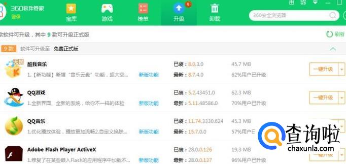 在弹出的界面里找到升级,找到Adobe Flash,点击一键升级即可。