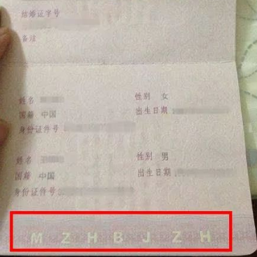 事情的缘由是这样的,小夫妻发现结婚证内页最下方印着一串英文字母:“MZHBJZH”,百思不得其解。随发帖:“结婚证下面有一排字母,这是啥含义?”