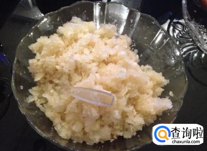 大蒜去皮,然后捣成蒜泥,把蒜汁倒出来。