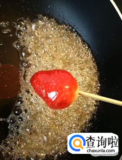接着我们把串好的水果在糖液中均匀的裹一层