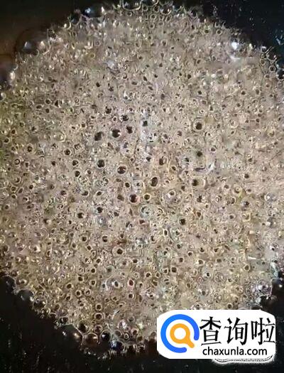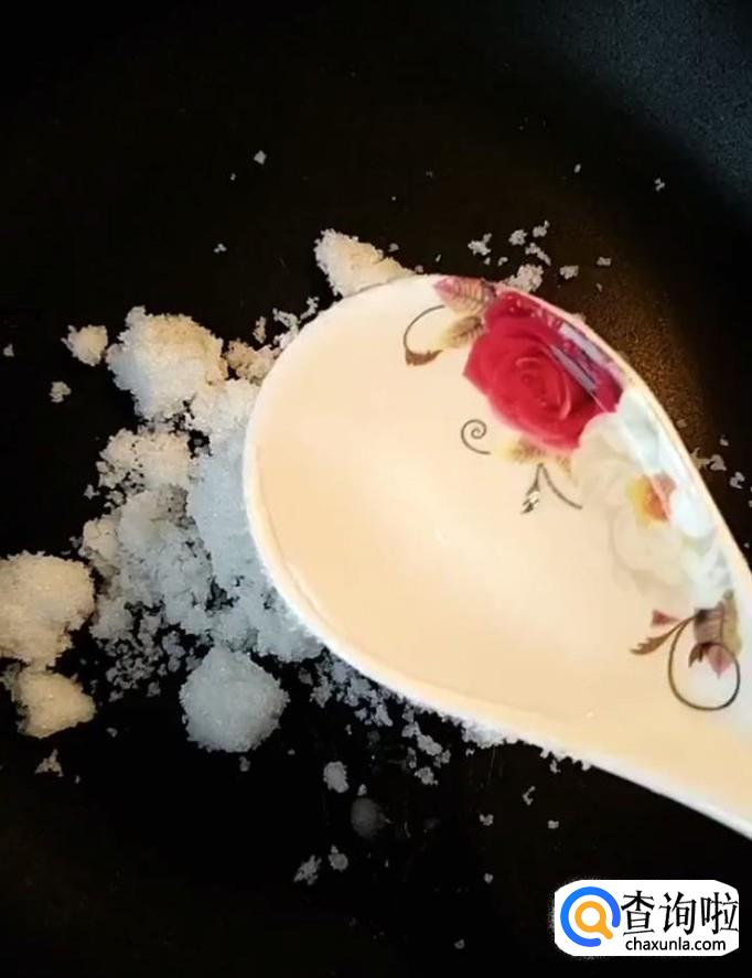 然后,我们在锅中放入两勺白糖,两勺清水,开小火慢熬,熬至焦糖色关火