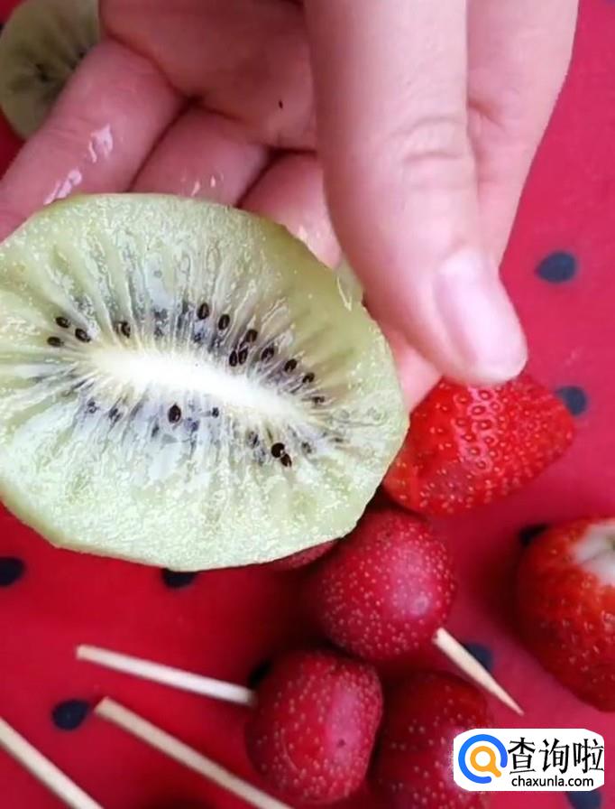 然后我们将准备好的水果清洗干净,切块,控干水分用竹签把它挨个串起来,备用