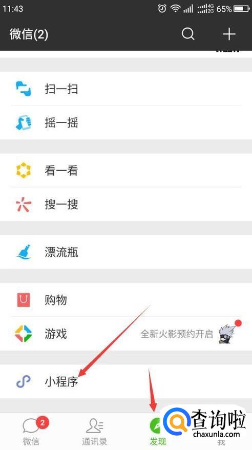 首先,打开微信,点击底部的发现,将界面向上滑动,点击小程序。