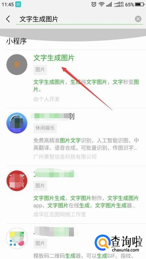 在搜索框输入文字生成图片,进行搜索,找到后点击文字生成图片小程序。
