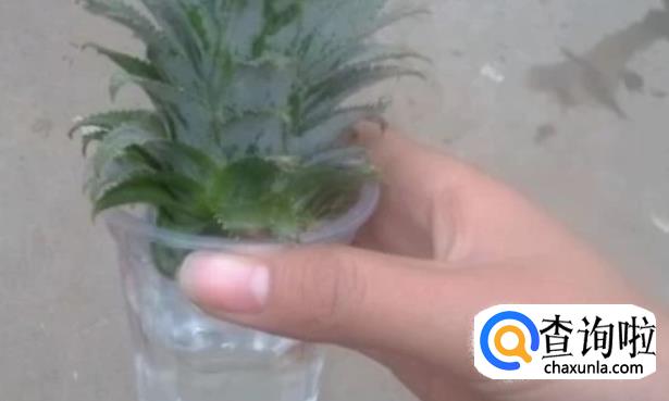 在透明杯中装水,把切好的菠萝头放入杯中,根部浸泡在水中三厘米左右,因为根部接触到水才能够生长发育。