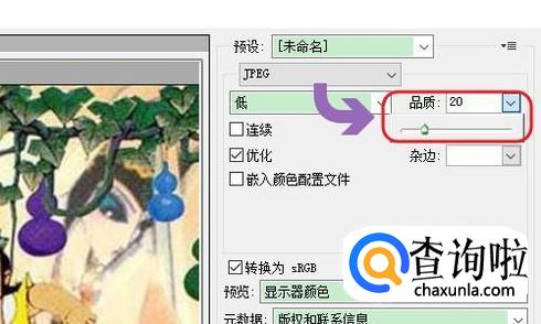 此外还有一种降低图片大小的方法,那就是降低图片的品质,如果降低品质呢?那就是在存储照片为web或者设备所用格式的时候,在软件的右上角将品质拖动到左侧就可以降低品质了,如图所示;