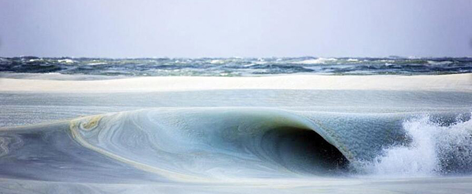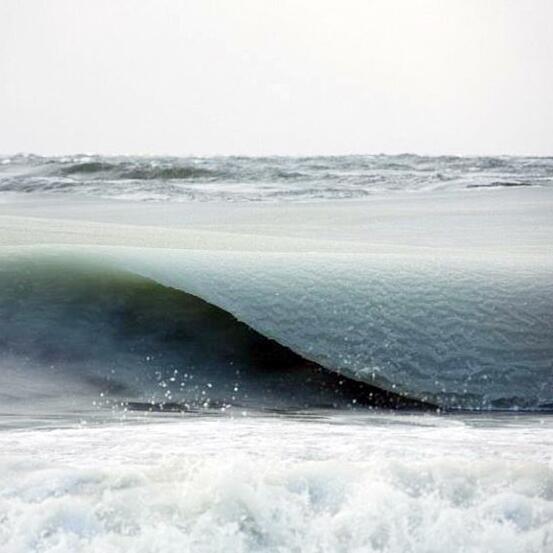 但是在近岸区域,由于水深较浅,对流规模很小,当温度剧烈降低(比如遭遇强寒潮),海水会迅速结冰。一旦海冰形成,由于各种可溶性盐会被水的结晶过程析出,所以造成下层未结冰海水的盐度迅速升高,于是密度变得更大,冰点变得更低。这时候如果有海浪搅动,就会出现“冰水混合”的现象,也就是“冰沙浪”。其实生活在北方沿海的人几乎年年可以见到这种浪。