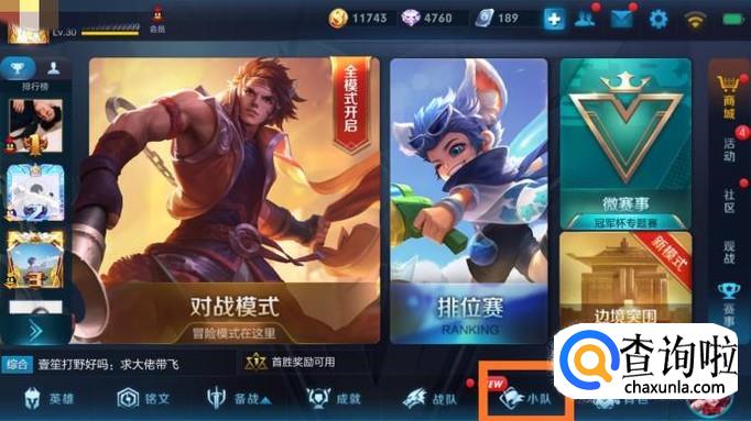 王者荣耀的小队是五人小队,也就是说只有五个人一起才能参加月赛,首先在大厅点击‘小队‘。
