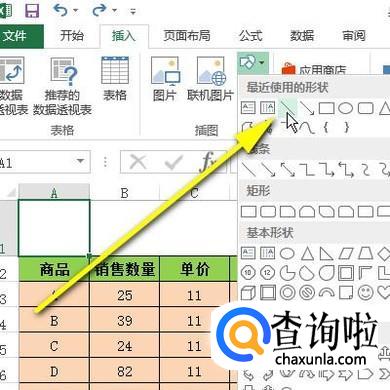 接下来,再演示另一种方法。点击“插入”选项卡,在下面展开的内容中点“形状”下拉按钮,在弹出的各种形状面板中,选中:直线