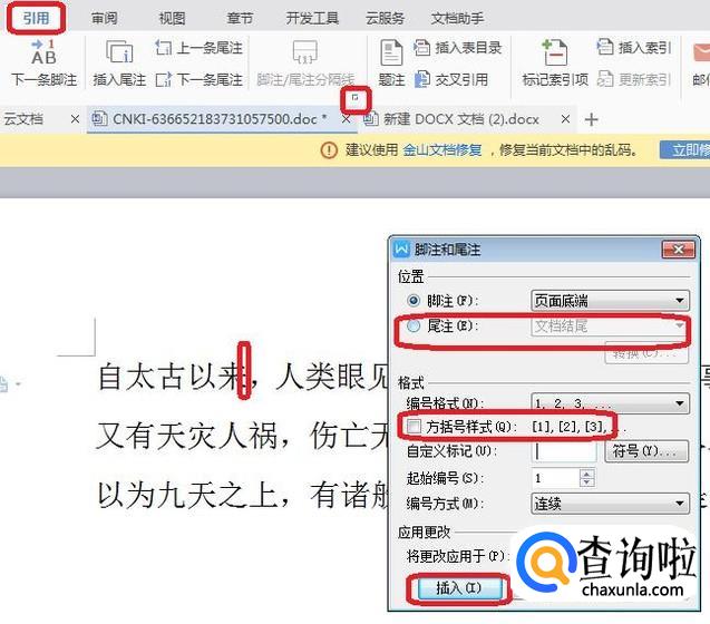 回到论文中,在需要引用参考文献的地方,插入尾注,设置格式就行。