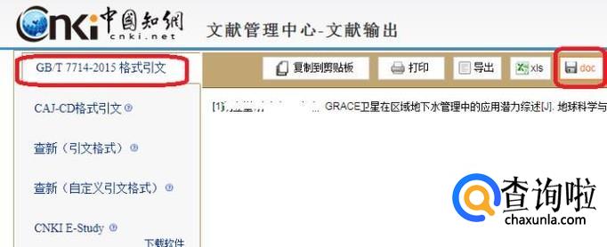 可以看到,能够导出国标格式的参考文献,点击“doc”图标,该条参考文献就能以word文档格式导出。我们可以把我们需要引用的参考文献逐一检索,然后批量导出。
