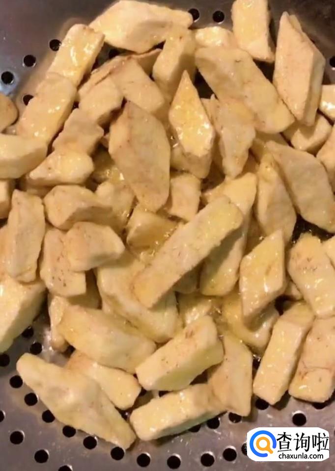 沾一层淀粉,锅烧油,油温五成热下锅炸,炸好捞出备用