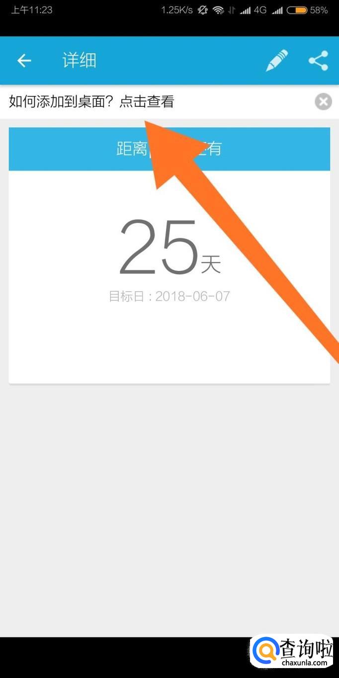 点击软件首页的倒数日事件记录,即可进入到记录的详细页面,软件会提示怎么把倒数日的提醒添加到手机桌面。