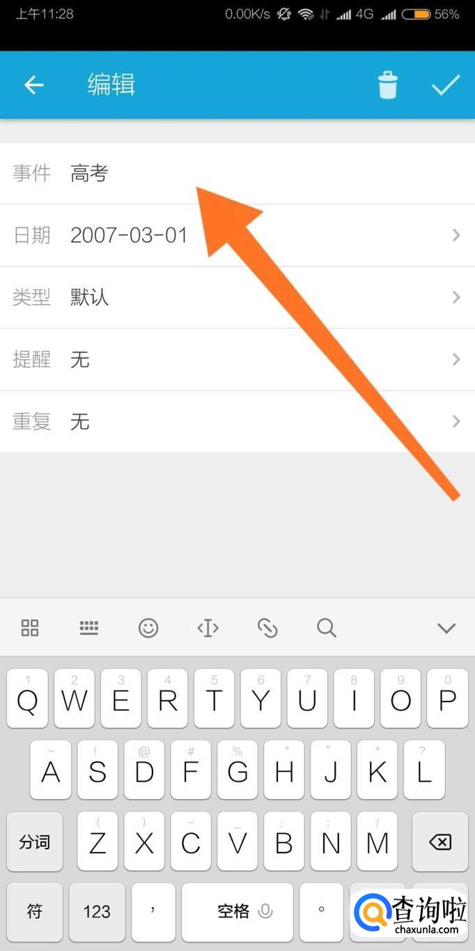 然后输入倒数日事件的名称和时间,点击“确定”即可添加完成。