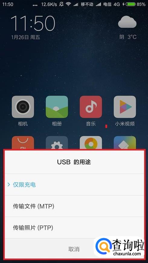点击了这个窗口后,就会弹出一个“USB的用途”对话框,这时我们就可以根据我们要传输的文件类型来选择用途。