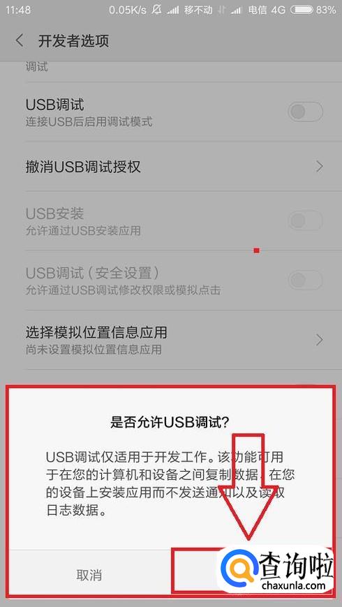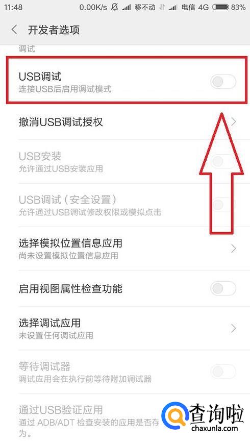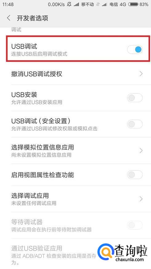 进入开发者选项后我们会看见很多选型,我们再往下划,找到”USB调试“,这时我们会发现这个选项右边的按钮是灰色的,这时我们点击这个按钮,系统会弹出一个提示框,我们这里点击确定就可以了,点击确定后这个选项右方的按钮就会变成蓝色,这时我们手机的USB调试就可以使用啦!