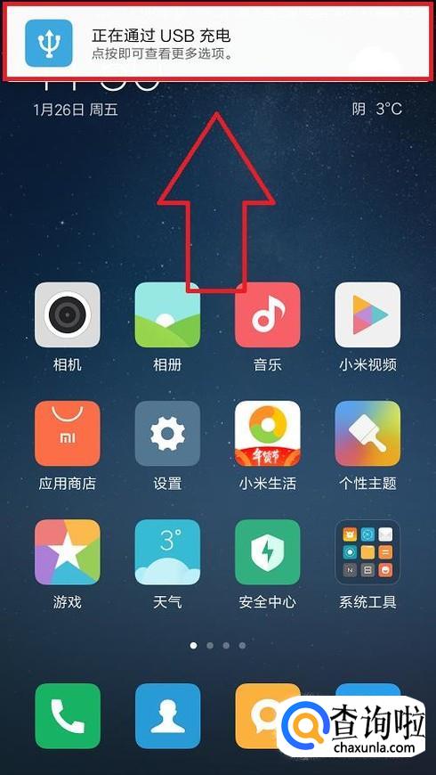首先我们将数据线的两端分别插在电脑和手机的USB接口上,如果是小米手机的话,这时手机上方就会弹出一个“正在通过USB充电”窗口,然后我们点击这个窗口。