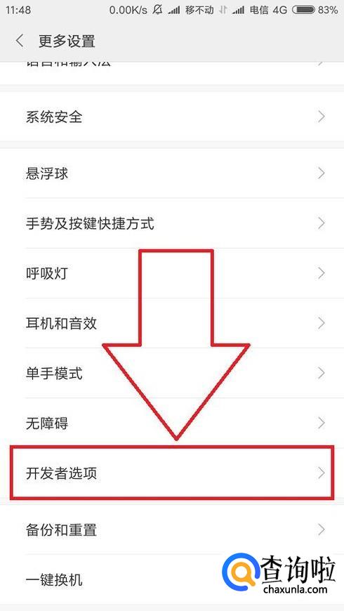 进入更多设置后我们再往下划找到”开发者选项“,点击并进入开发者选项。