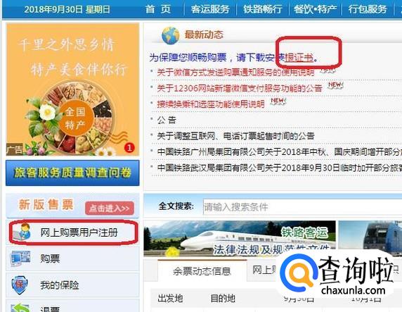 进入12306主页后,我们首先需要点击图中标记处,安装根证书(类似一个小插件)。然后如图所示,点击“网上购票用户注册”。