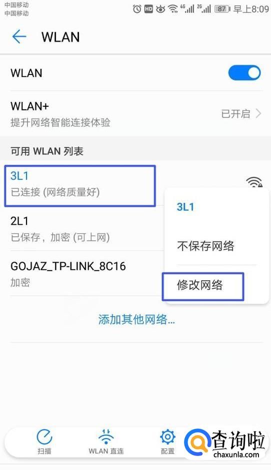 然后我们长按连接的无线网络,弹出的界面,我们点击修改网络;