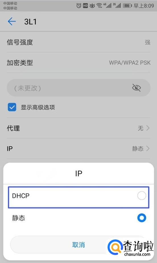 弹出的界面,我们选择DHCP,因为原先的IP被设置为静态了,导致连上却上不了网;
