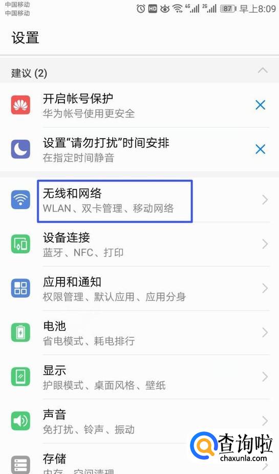 然后点击无线和网络;