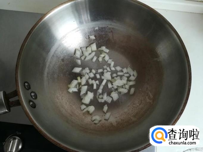 炒锅放花生油,油六成热时,把洋葱粒入锅煸香。