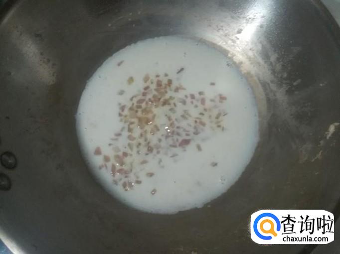 再把炒好的洋葱粒倒入牛奶锅内,调小火慢煮。