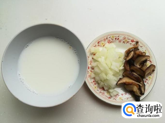 把牛奶倒入碗里,洋葱切成碎粒,香菇切成片。