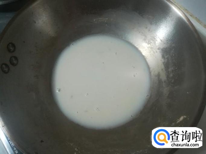 把牛奶倒入锅里,大火把牛奶煮开煮熟。