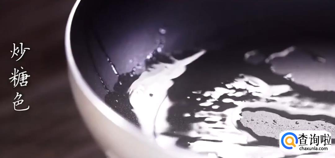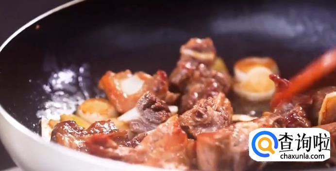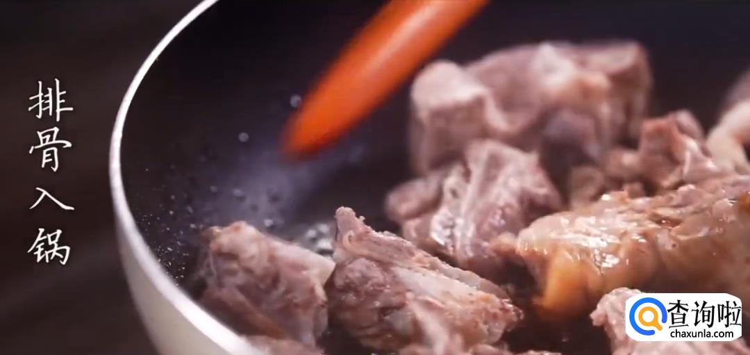 热锅起油,下冰糖炒化了,起糖色,将排骨倒入锅中翻炒上色。