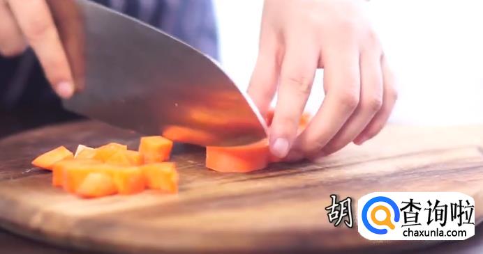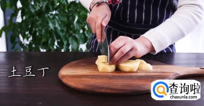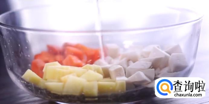 胡萝卜,杏鲍菇,土豆切丁后用清水浸泡。
