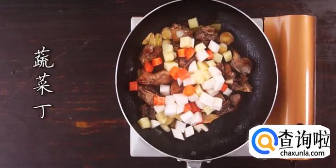 将各种蔬菜丁下锅翻炒均匀。