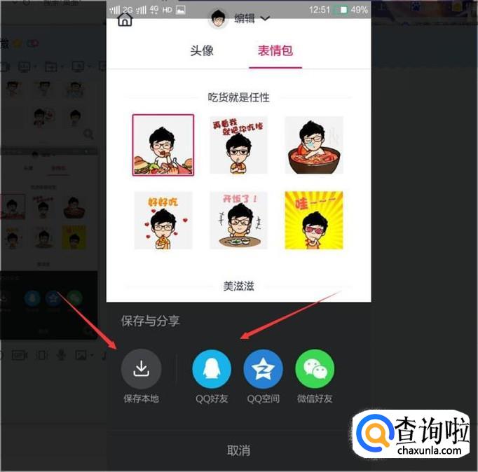 点击其中的一张表情包或者头像,即可保存到手机,或者发送给好友。