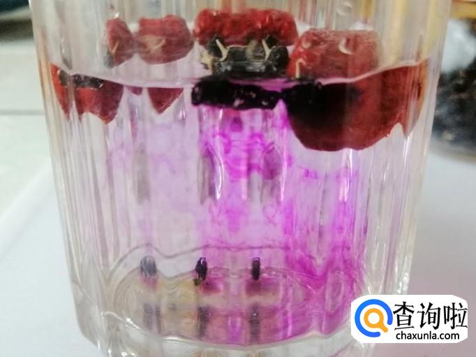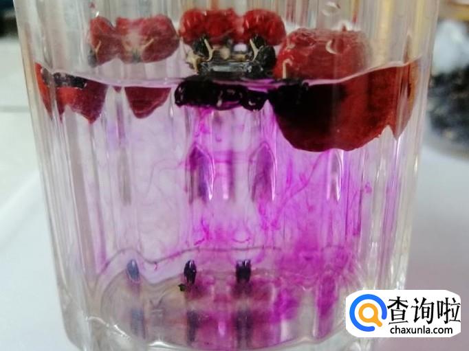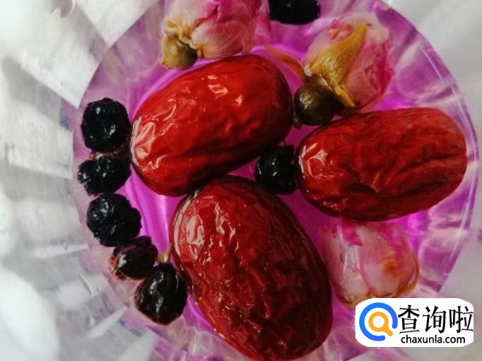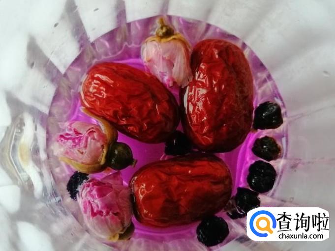 如图所示红枣已泡胀,黑枸杞不断在释放花青素,还有玫瑰花的花瓣已泡开,看着泡好的养生水真是赏心悦目。