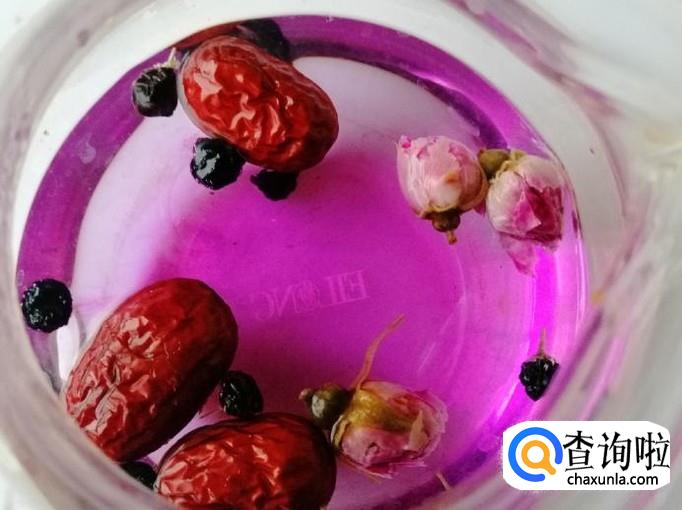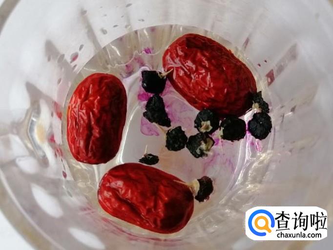 黑枸杞10粒左右,温水适量,红枣3个,玫瑰花3个
