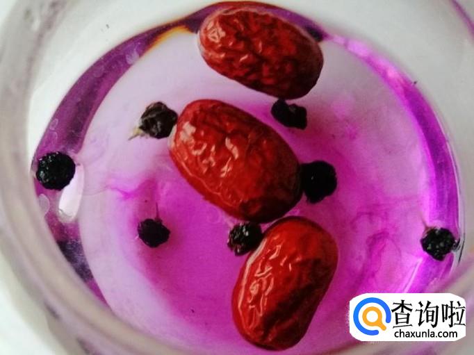 等红枣泡的差不时候打开杯盖,尝一下水温不是很热的时候加入备好的黑枸杞,水温在四五十度时候放黑枸杞是最好的,这时候黑枸杞放入杯中,慢慢释放出花青素,泡出的水颜色好看而且还营养。
