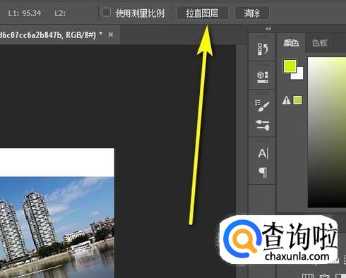 鼠标再多到上面的属性栏这里。点击:拉直图层;即把倾斜的图像拉直。