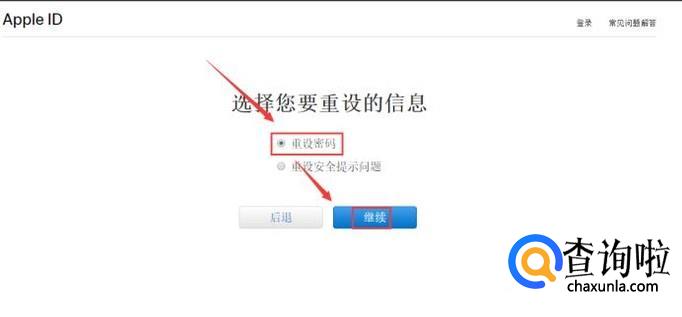 在跳转的页面输入需要修改密码的Apple ID,点击继续,然后点选“重设密码”,点击“继续”。