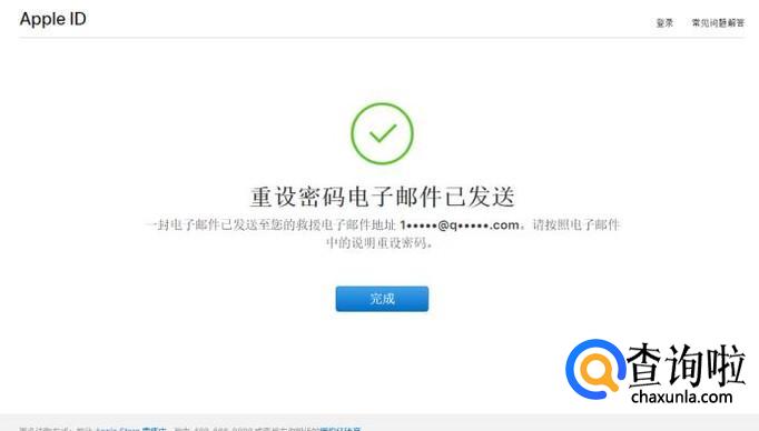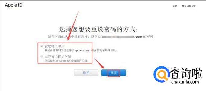 在选择重设密码的方式页面点选“获取电子邮件”,然后点击“继续”,重置密码的链接就会发送到当初设置的求援电子邮箱中。当然,如果记得安全提示问题的话,也可以通过安全问题找回密码。