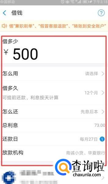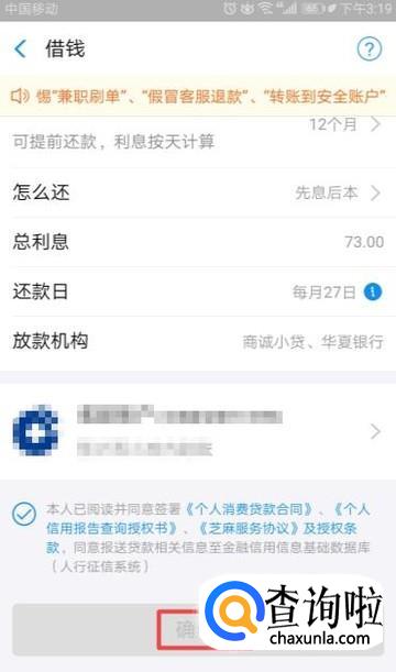 然后我们填写相关信息,最后我们点击下方的确定就可以了。这样我们就在支付宝上面借钱成功了。