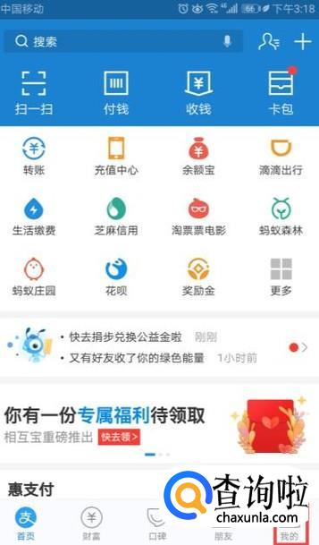首先,我们打开我们的手机,然后我们打开我们手机上的支付宝,之后我们点击支付宝右下角我的;