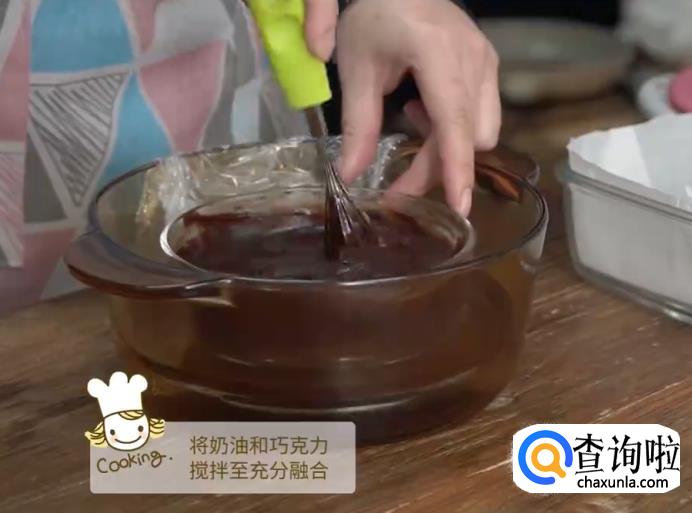 揭开保鲜膜,将奶油和巧克力搅拌至充分融合。