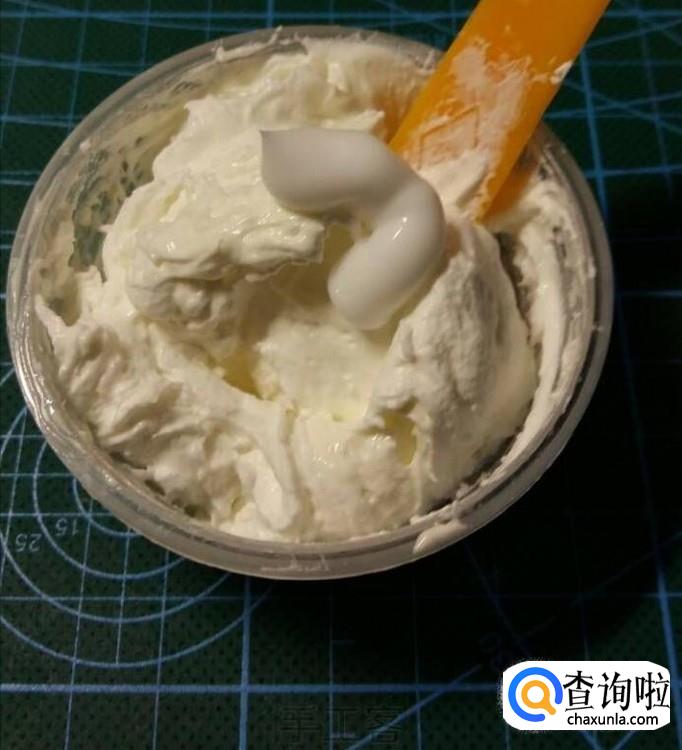 牙膏和粘土差不多混匀后,再放入护手霜,护手霜的量不要太多了,不然仿真奶油做出来后不成型。